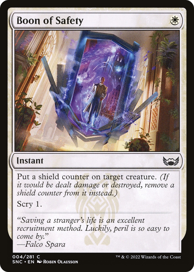 Put a shield counter on target creature. (If it would be dealt damage or destroyed, remove a shield counter from it instead.)
