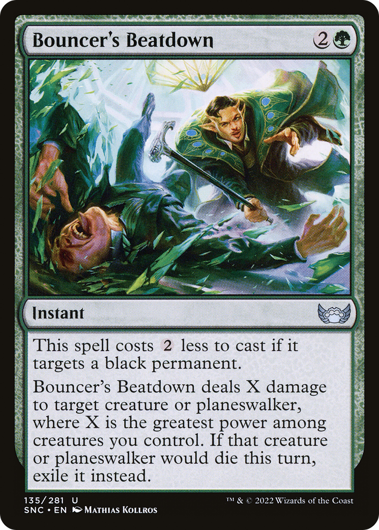 Bouncer's Beatdown deals X damage to target creature or planeswalker, where X is the greatest power among creatures you control. If that creature or planeswalker would die this turn, exile it instead.