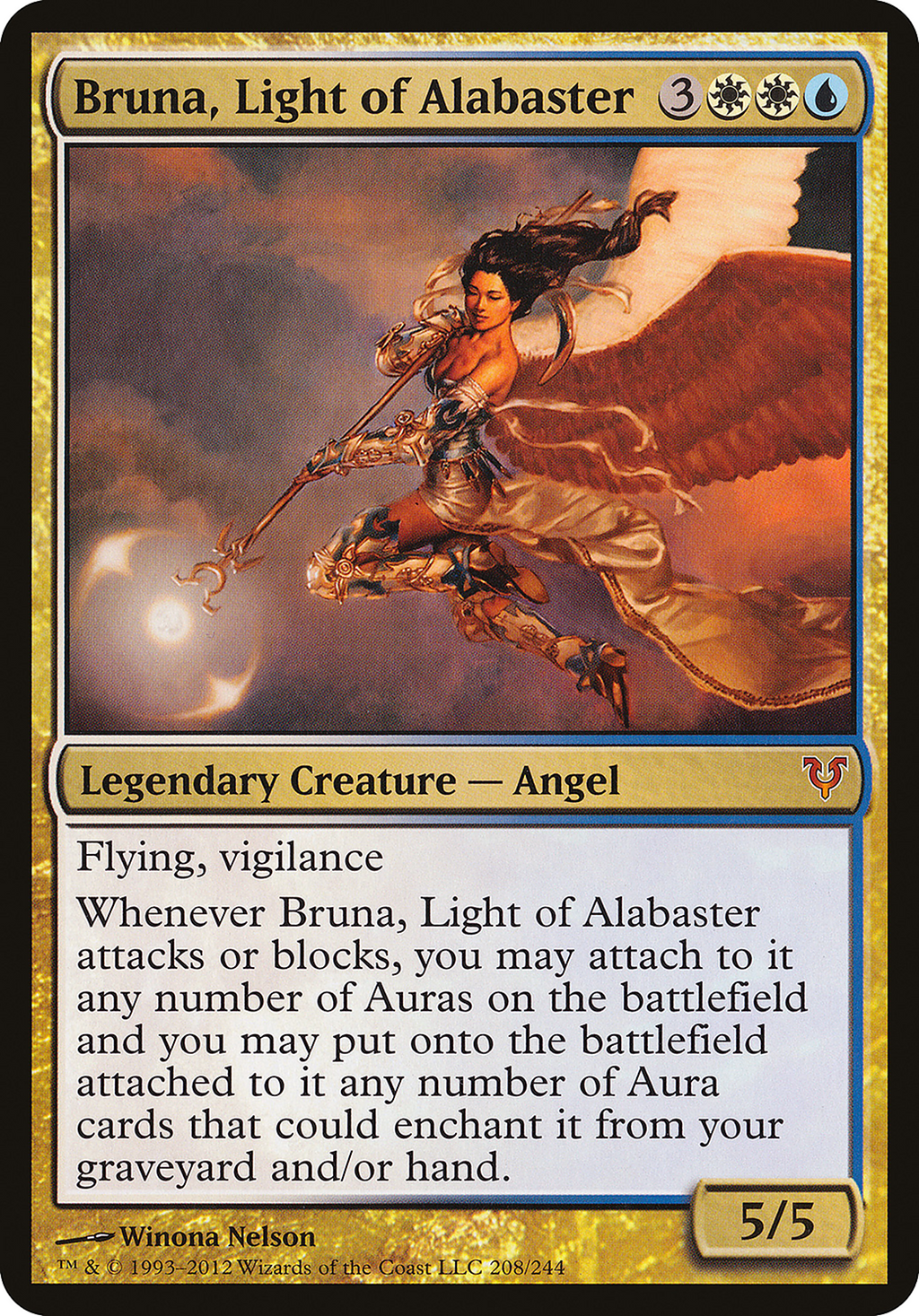 Whenever Bruna, Light of Alabaster attacks or blocks, you may attach to it any number of Auras on the battlefield and you may put onto the battlefield attached to it any number of Aura cards that could enchant it from your graveyard and/or hand.