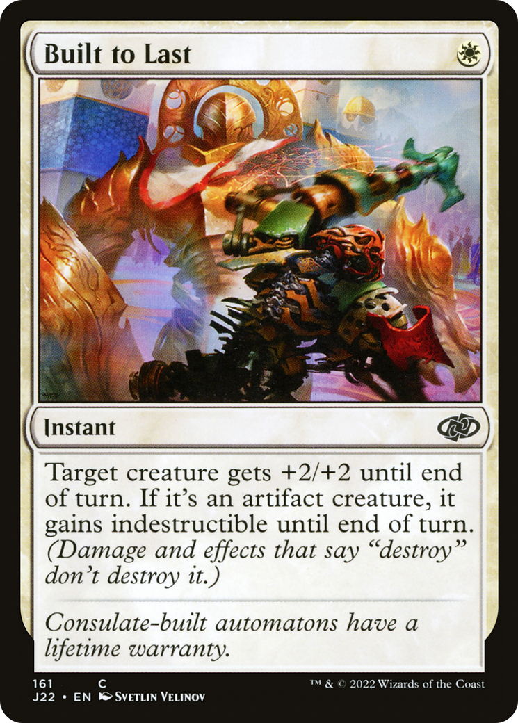 Target creature gets +2/+2 until end of turn. If it's an artifact creature, it gains indestructible until end of turn. (Damage and effects that say "destroy" don't destroy it.)