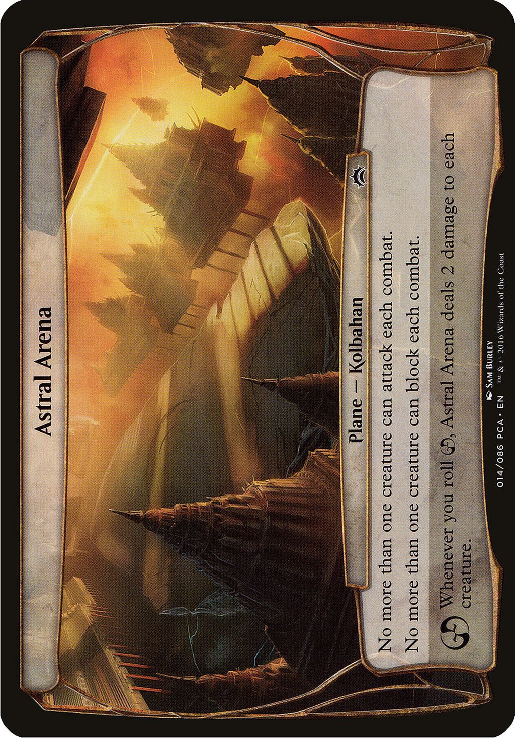 No more than one creature can attack each combat. No more than one creature can block each combat. Whenever you roll {CHAOS}, Astral Arena deals 2 damage to each creature.