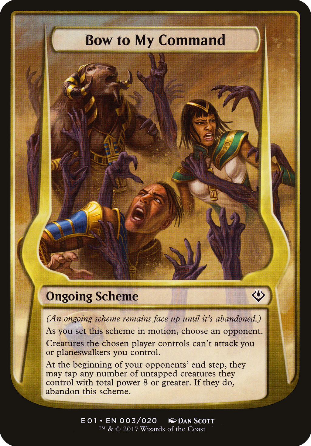 At the beginning of your opponents' end step, they may tap any number of untapped creatures they control with total power 8 or greater. If they do, abandon this scheme.