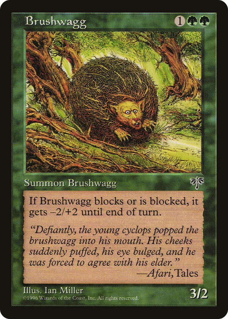 Whenever Brushwagg blocks or becomes blocked, it gets -2/+2 until end of turn.