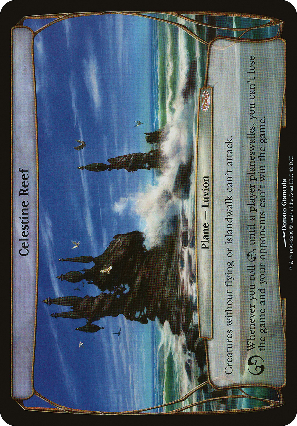 Creatures without flying or islandwalk can't attack. Whenever you roll {CHAOS}, until a player planeswalks, you can't lose the game and your opponents can't win the game.