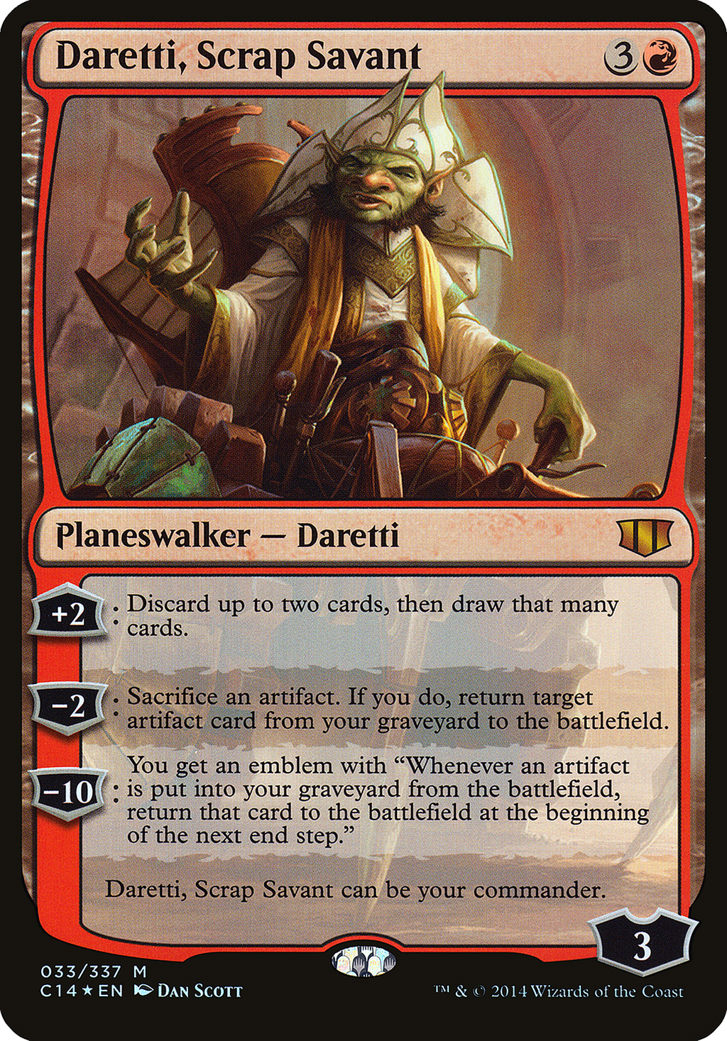 −10: You get an emblem with "Whenever an artifact is put into your graveyard from the battlefield, return that card to the battlefield at the beginning of the next end step."
