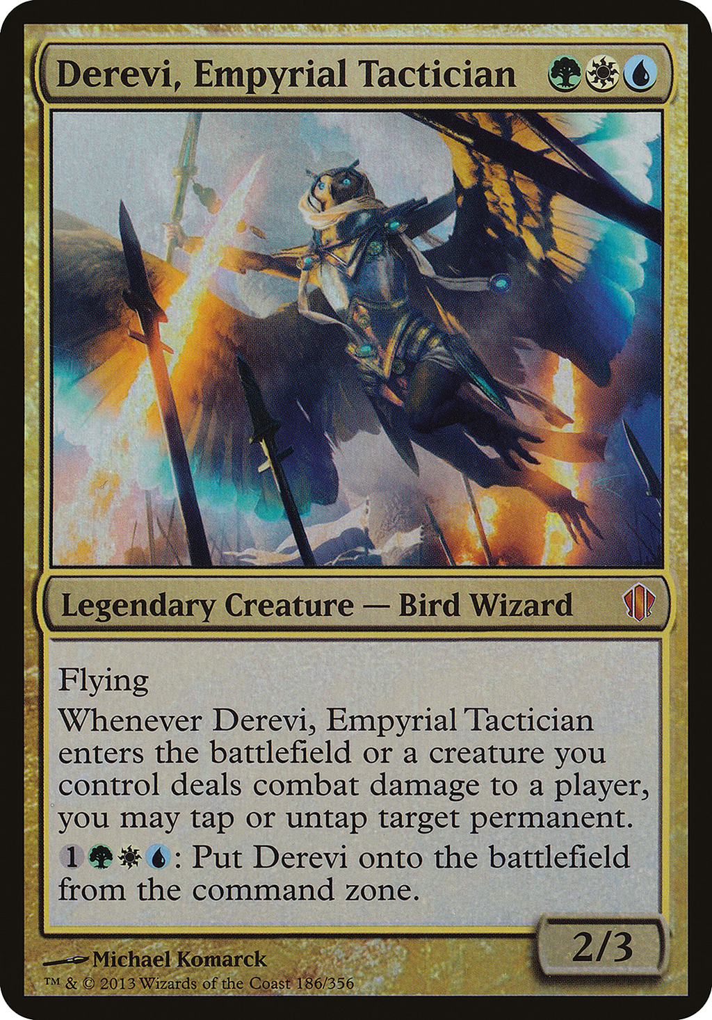 {1}{G}{W}{U}: Put Derevi onto the battlefield from the command zone.