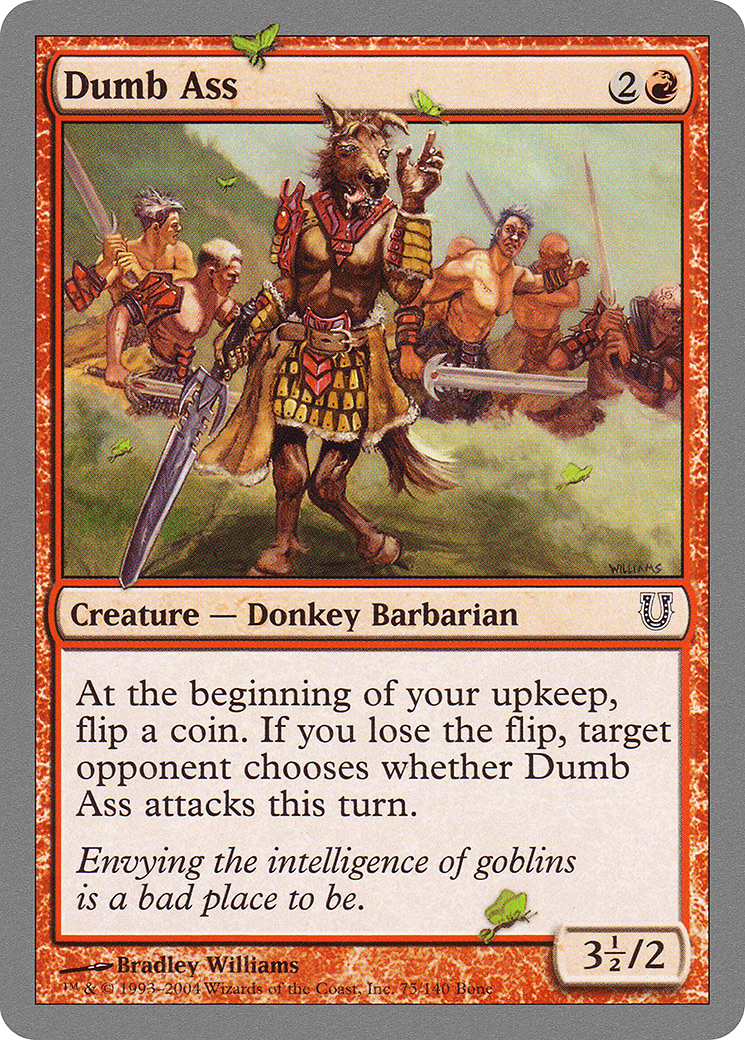 At the beginning of your upkeep, flip a coin. If you lose the flip, target opponent chooses whether Dumb Ass attacks this turn.