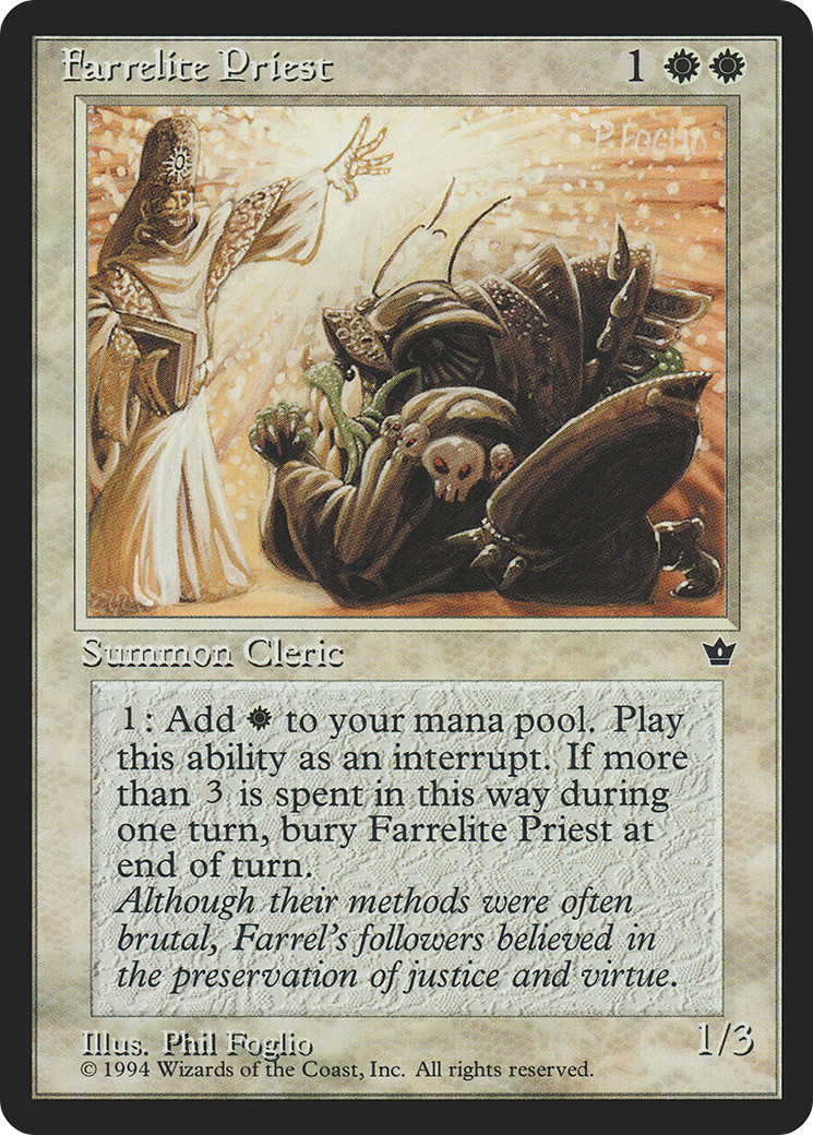 {1}: Add {W}. If this ability has been activated four or more times this turn, sacrifice Farrelite Priest at the beginning of the next end step.
