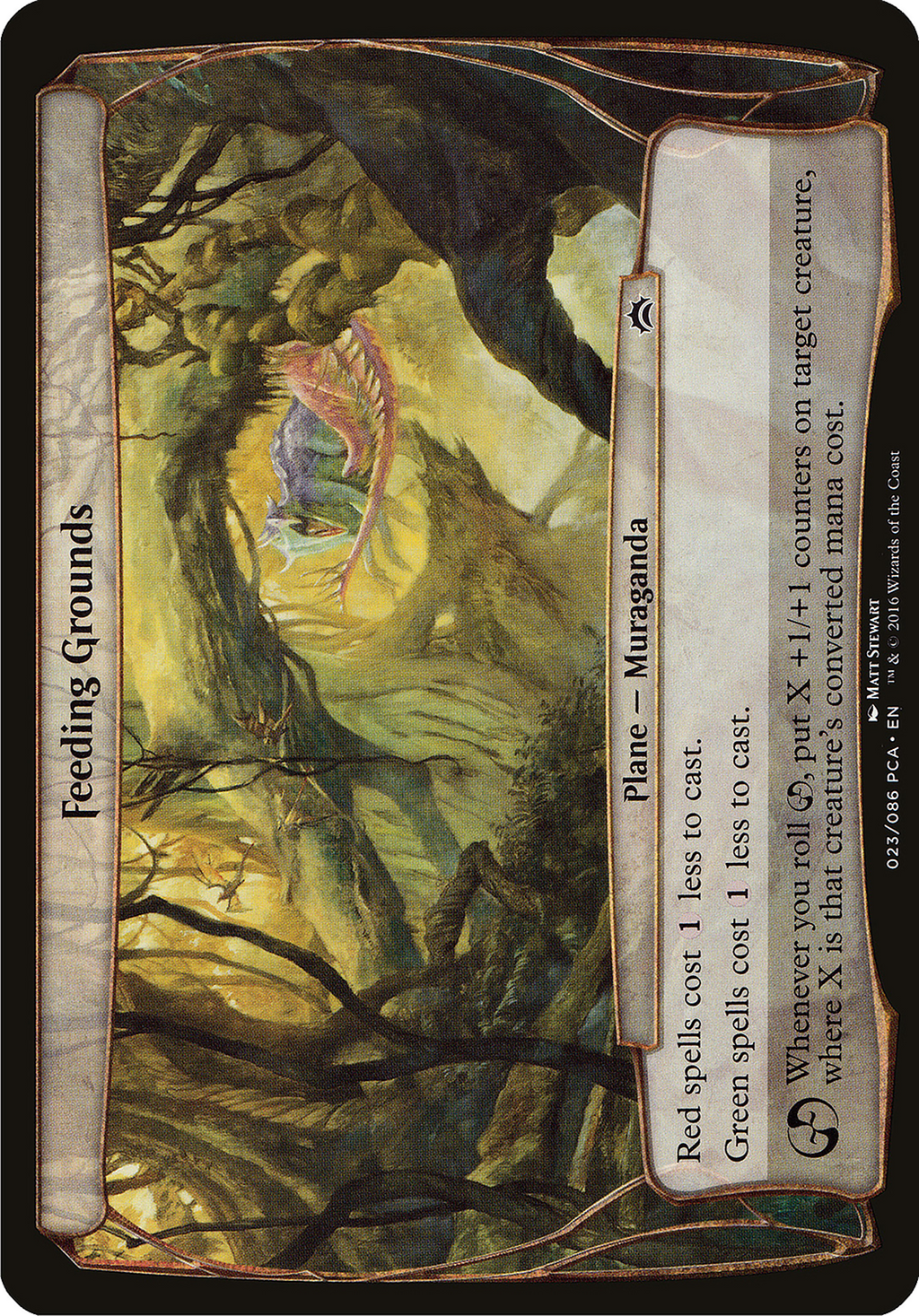 Red spells cost {1} less to cast. Green spells cost {1} less to cast. Whenever you roll {CHAOS}, put X +1/+1 counters on target creature, where X is that creature's mana value.