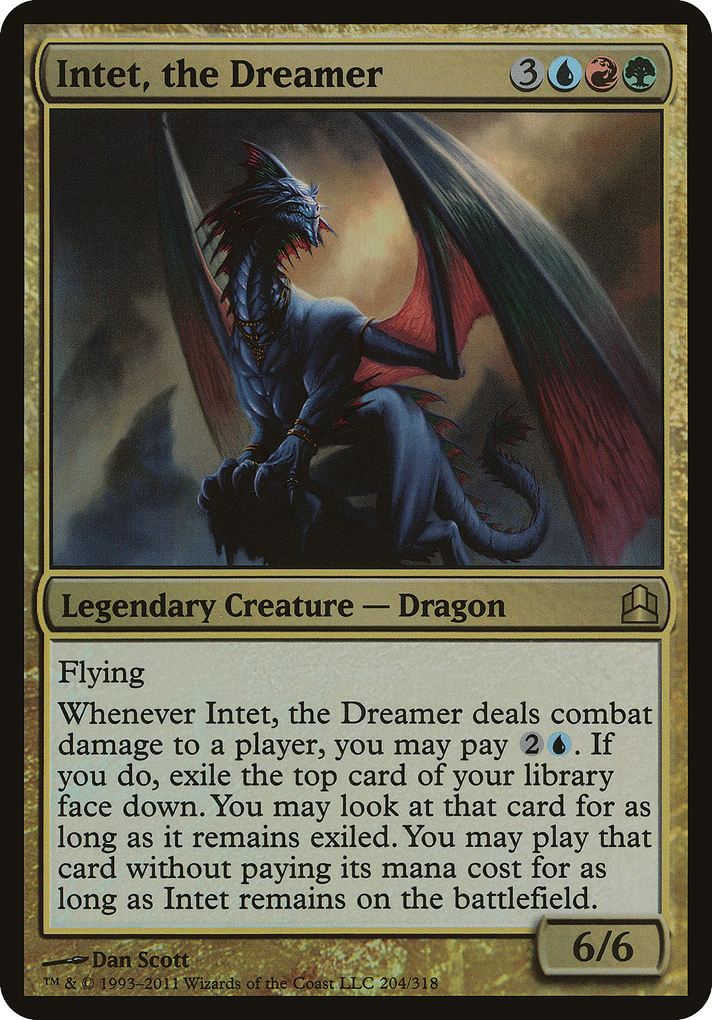 Whenever Intet, the Dreamer deals combat damage to a player, you may pay {2}{U}. If you do, exile the top card of your library face down. You may look at that card for as long as it remains exiled. You may play that card without paying its mana cost for as long as Intet remains on the battlefield.