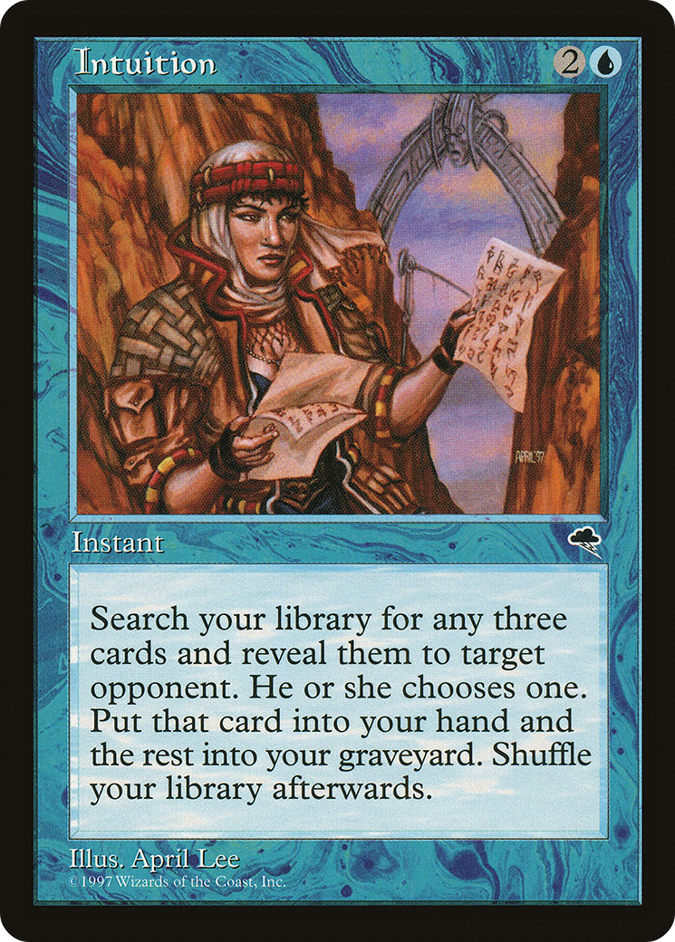 Search your library for three cards and reveal them. Target opponent chooses one. Put that card into your hand and the rest into your graveyard. Then shuffle.