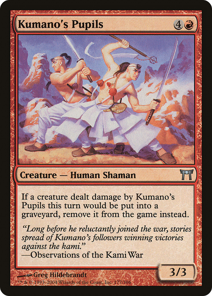 If a creature dealt damage by Kumano's Pupils this turn would die, exile it instead.