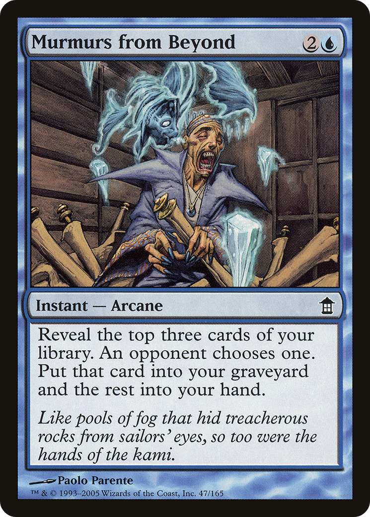 Reveal the top three cards of your library. An opponent chooses one of them. Put that card into your graveyard and the rest into your hand.