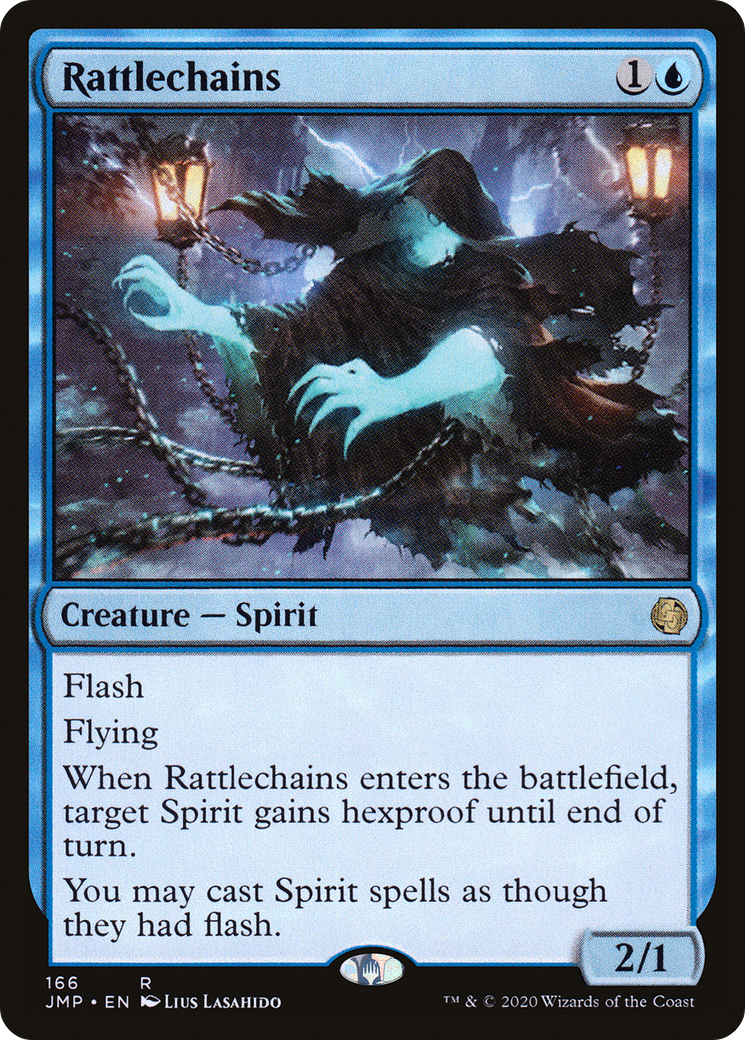 Flash Flying When Rattlechains enters the battlefield, target Spirit gains hexproof until end of turn. You may cast Spirit spells as though they had flash.