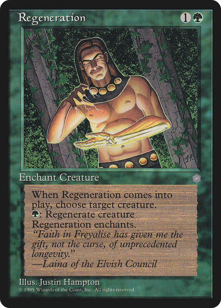{G}: Regenerate enchanted creature. (The next time that creature would be destroyed this turn, it isn't. Instead tap it, remove all damage from it, and remove it from combat.)