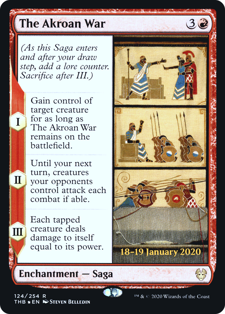 I — Gain control of target creature for as long as The Akroan War remains on the battlefield.