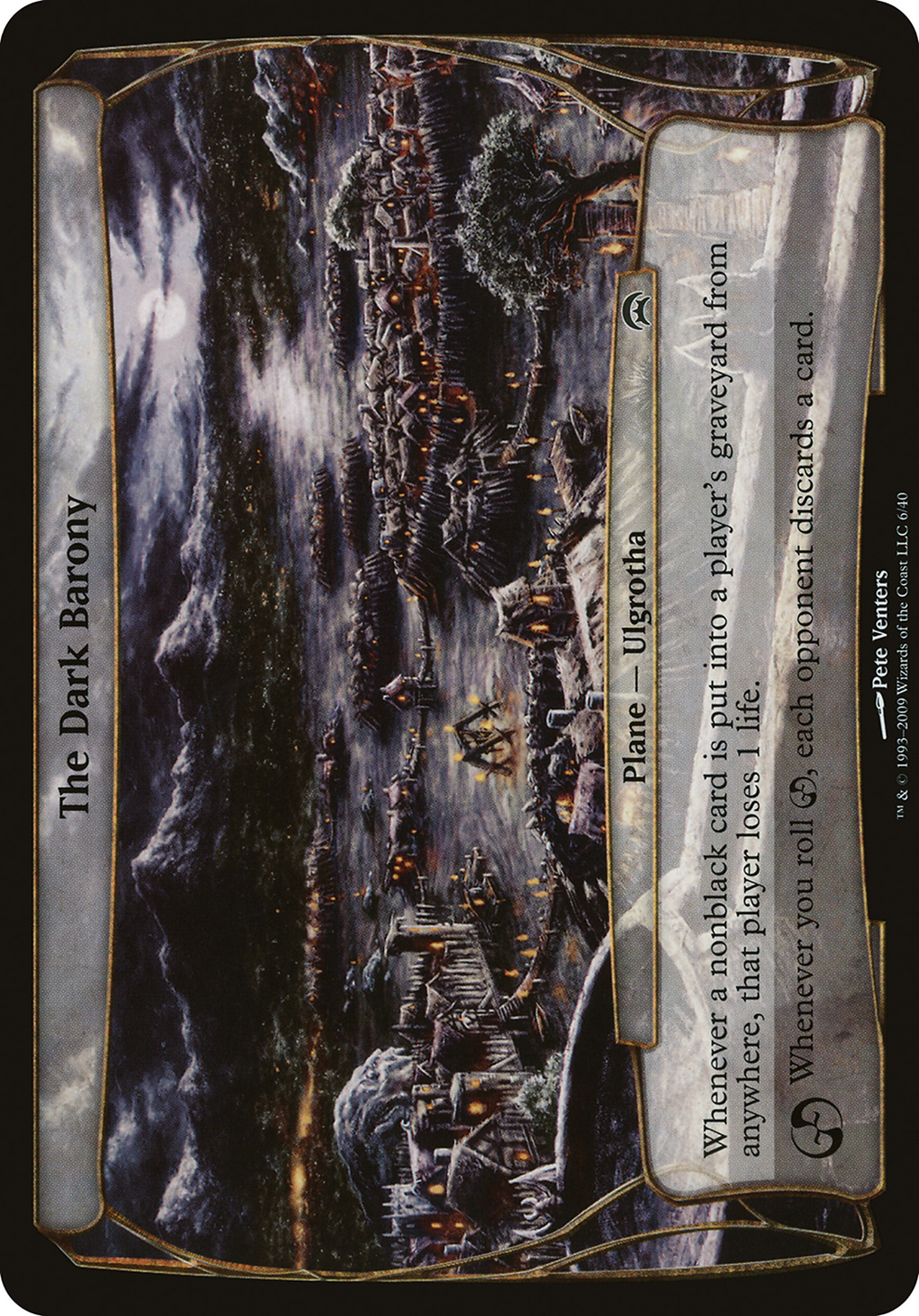 Whenever a nonblack card is put into a player's graveyard from anywhere, that player loses 1 life. Whenever you roll {CHAOS}, each opponent discards a card.
