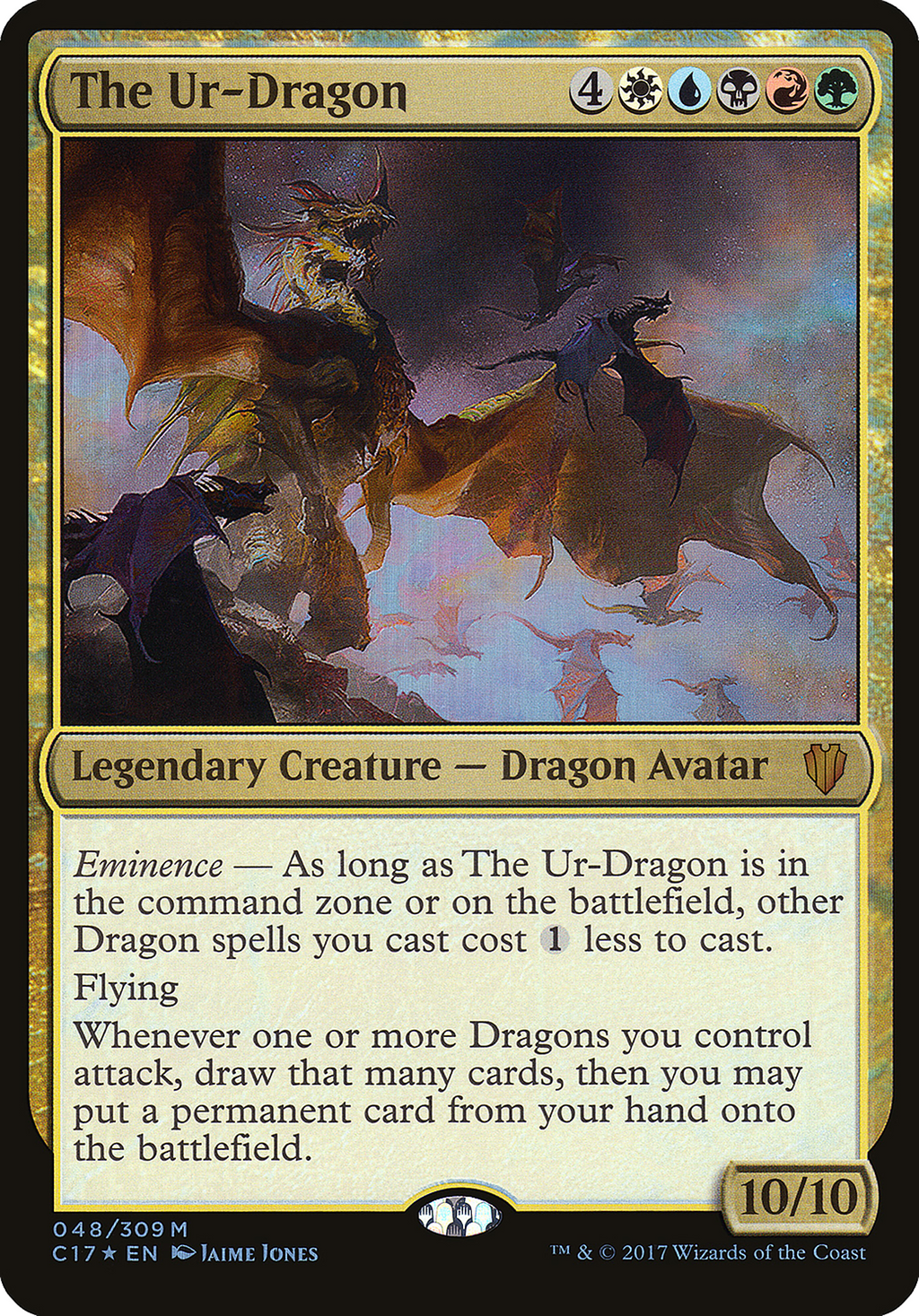Eminence — As long as The Ur-Dragon is in the command zone or on the battlefield, other Dragon spells you cast cost {1} less to cast.
