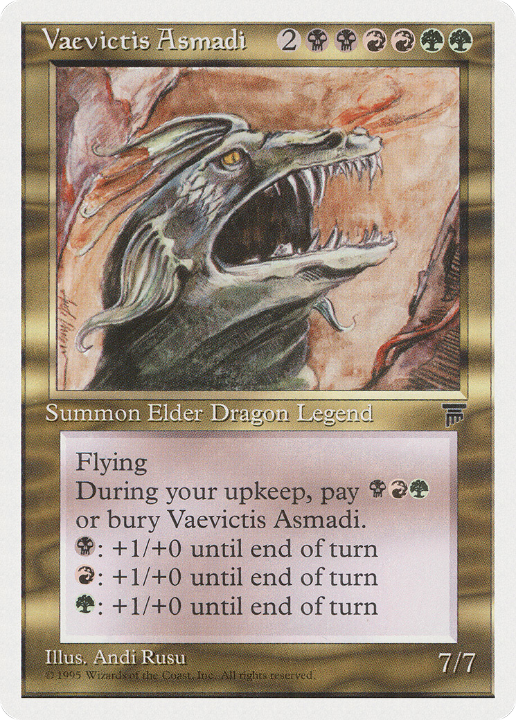 At the beginning of your upkeep, sacrifice Vaevictis Asmadi unless you pay {B}{R}{G}.