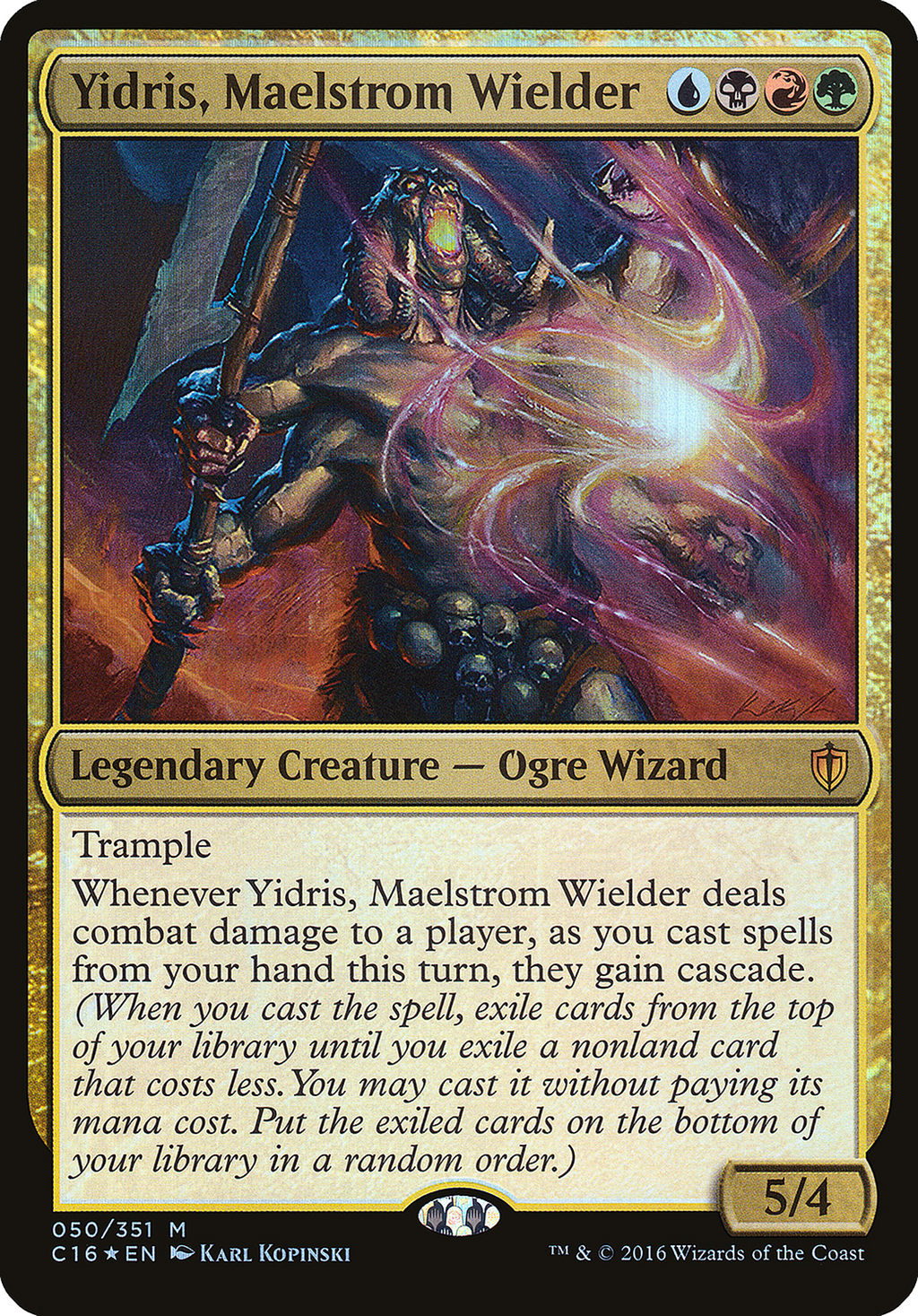 Whenever Yidris, Maelstrom Wielder deals combat damage to a player, as you cast spells from your hand this turn, they gain cascade. (When you cast the spell, exile cards from the top of your library until you exile a nonland card that costs less. You may cast it without paying its mana cost. Put the exiled cards on the bottom of your library in a random order.)