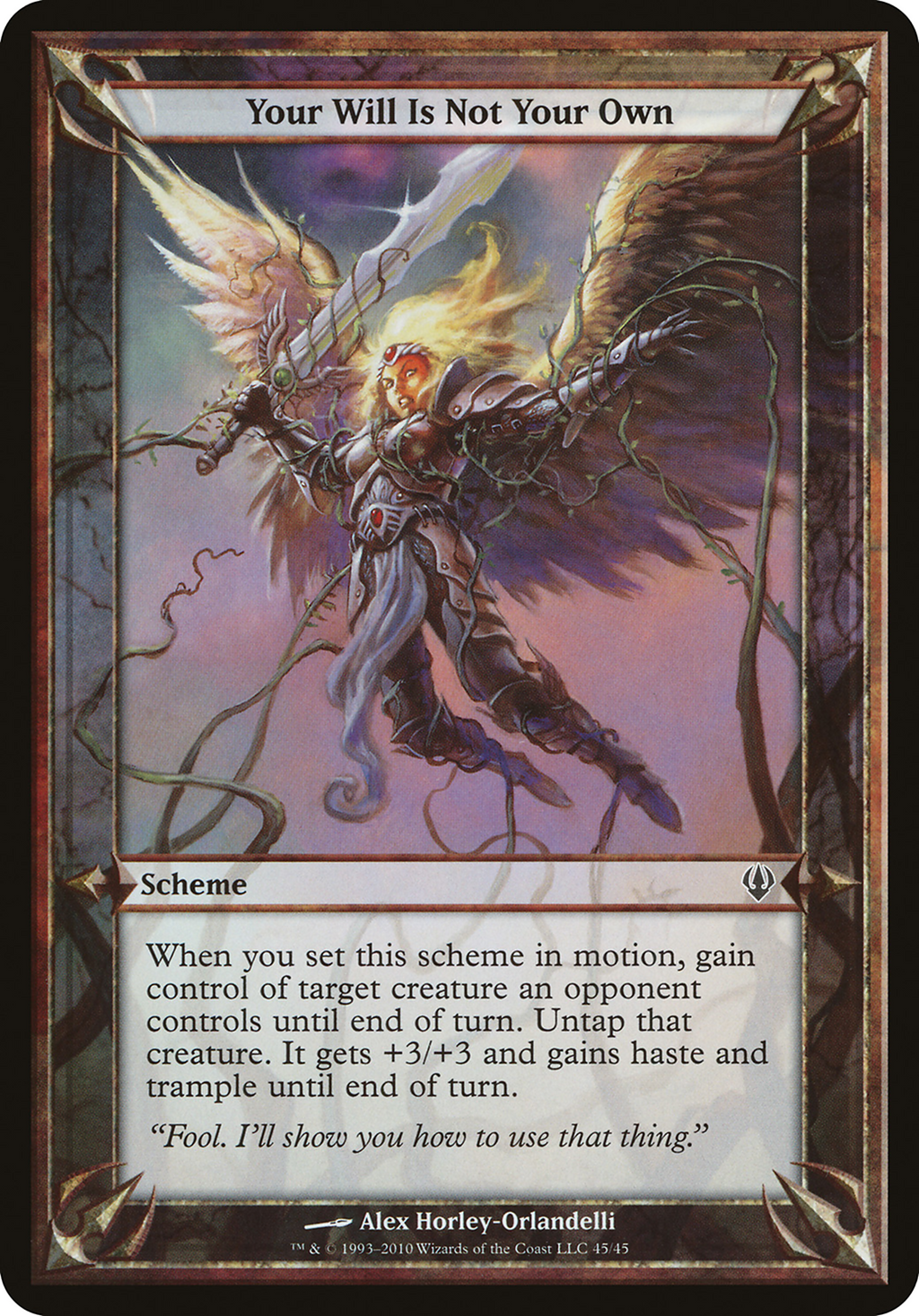 When you set this scheme in motion, gain control of target creature an opponent controls until end of turn. Untap that creature. It gets +3/+3 and gains trample and haste until end of turn.
