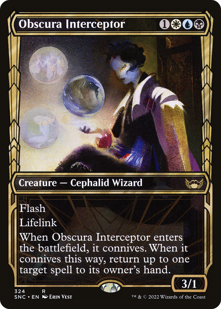 When Obscura Interceptor enters the battlefield, it connives. When it connives this way, return up to one target spell to its owner's hand. (To have a creature connive, draw a card, then discard a card. If you discarded a nonland card, put a +1/+1 counter on that creature.)
