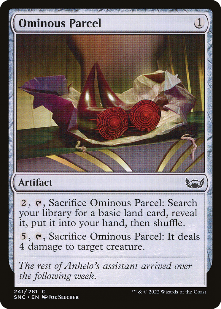 {2}, {T}, Sacrifice Ominous Parcel: Search your library for a basic land card, reveal it, put it into your hand, then shuffle.