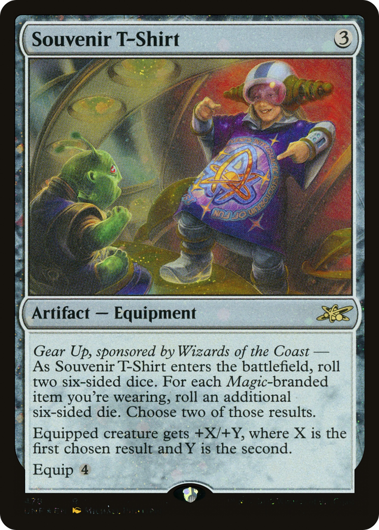Gear Up, sponsored by Wizards of the Coast — As Souvenir T-Shirt enters the battlefield, roll two six-sided dice. For each Magic-branded item you're wearing, roll an additional six-sided die. Choose two of those results.